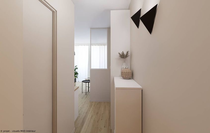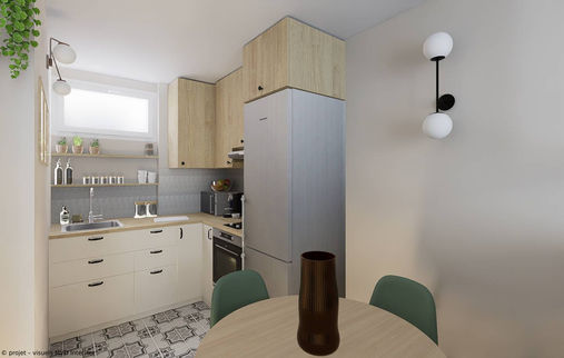 Le renfoncement existant nous permet de redessiner une cuisine fonctionnelle et équipée, associée à un coin salle à manger isolée du salon.